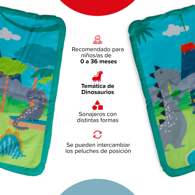 El Gimnasio de Actividades Bebesit 5010 Dino Turquesa transforma cualquier piso en un mundo prehistórico lleno de juego y estimulación. Su suelo acolchado con ilustraciones de dinosaurios, sus arcos suaves y los colgantes interactivos invitan al bebé a explorar texturas, colores y sonidos mientras permanece cómodo y seguro.