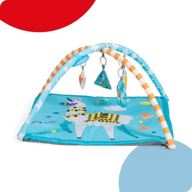 El Gimnasio de Actividades Bebesit 5010 Llama Celeste transforma cualquier rincón en un espacio de juego suave, colorido y estimulante. Su base acolchada con ilustraciones encantadoras de una llama celeste, sus arcos suaves y colgantes interactivos invitan al bebé a descubrir nuevas texturas, colores y sonidos, mientras juega cómodo y seguro.