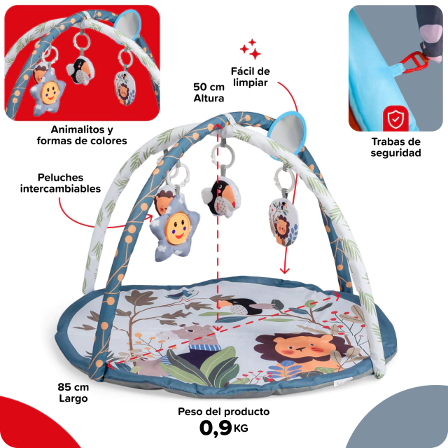 • Arcos Interactivos: Equipado con arcos suaves y ajustables que sostienen juguetes colgantes coloridos, cada uno con texturas, sonidos y formas distintas para una experiencia sensorial completa.
