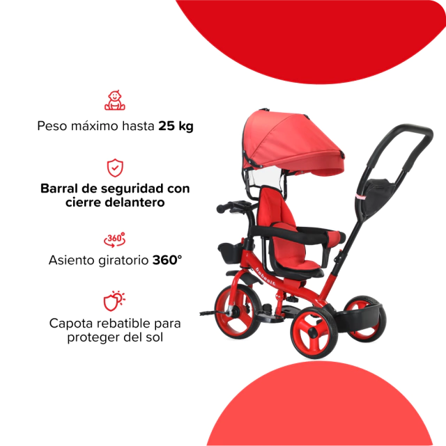 Incluye: Triciclo desarmado, manija de empuje, asiento giratorio, capota, apoyapiés, canastos, luz delantera, instructivo.