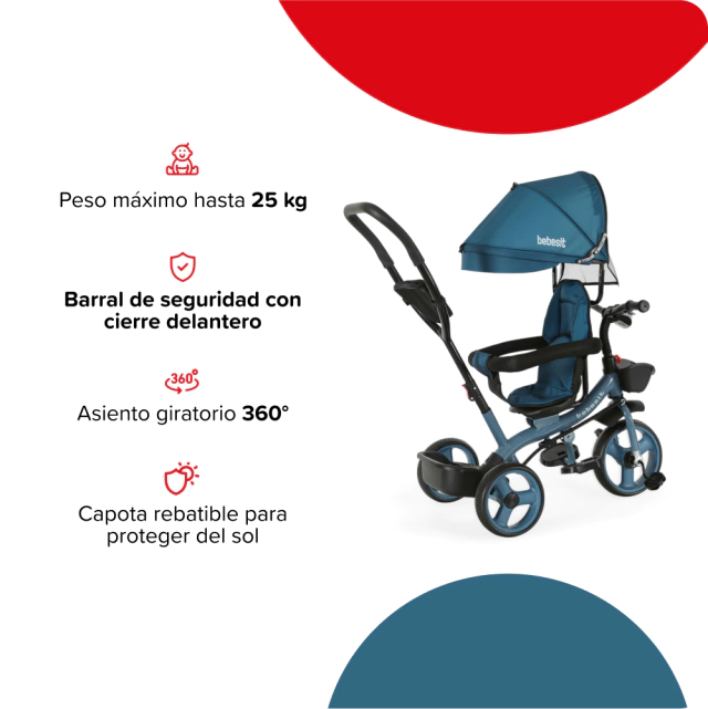 El Triciclo Bebesit Joy 3 está pensado para acompañar a tu bebé en sus primeras aventuras. Con un asiento giratorio 360°, manija direccional, estructura reforzada y capota para proteger del sol, este modelo combina seguridad, confort y estilo.