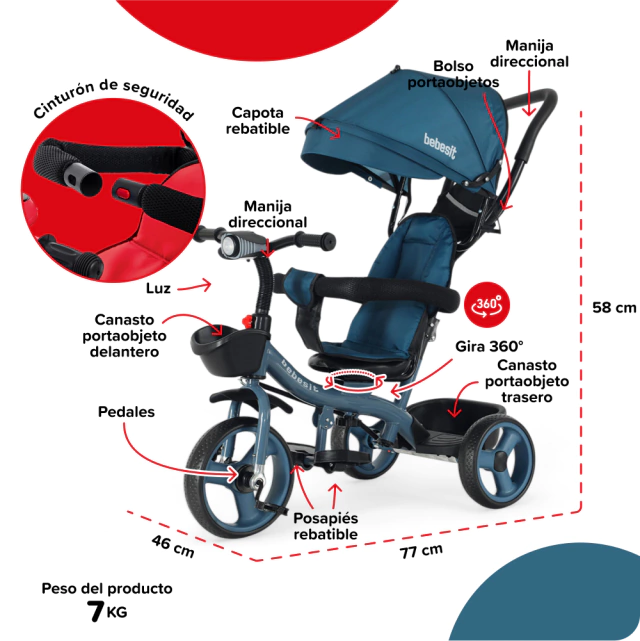 Incluye: Triciclo desarmado, manija de empuje, asiento giratorio, capota, apoyapiés, canastos, luz delantera, instructivo.
